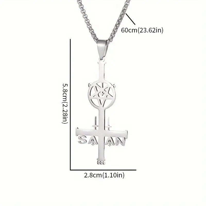 Satanic Inverted Cross With Pentagram NecklaceType: Pendant NecklaceColor: SilverPlating: Silver PlatedThe Main Material: Stainless Steel