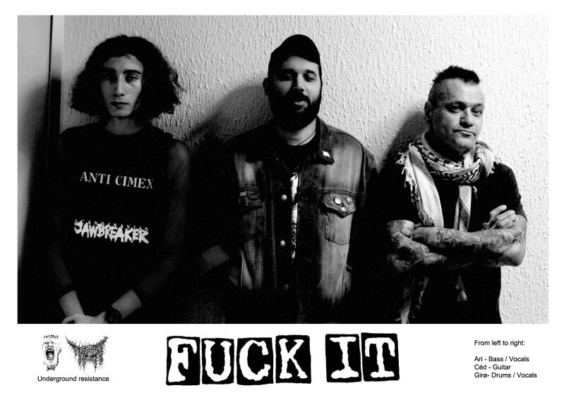 FUCK IT is a Portuguese punk band from Porto, founded by Girø (Renegados do Boliqueime, Freedoom, Dokuga, Dimmer Future...) and Céd (Gorgámisco Pornoblastoma, Disfigured Human Mind, Insolência, Drenagem, Stercore, Hypomania...). These two creatures from the back alleys of the underworld decided to join forces like stray dogs to found FUCK IT, which presents a direct approach, expressed by a minimalist sound and an anti-conformist stance of protest against the oppression perpetrated by cultural elitism. To complete FUCK IT's lineup, young Spell (Estriknina, Dimmer Future) was adopted from the shelter to join the pack and came to help in the fight against banality and the obvious.